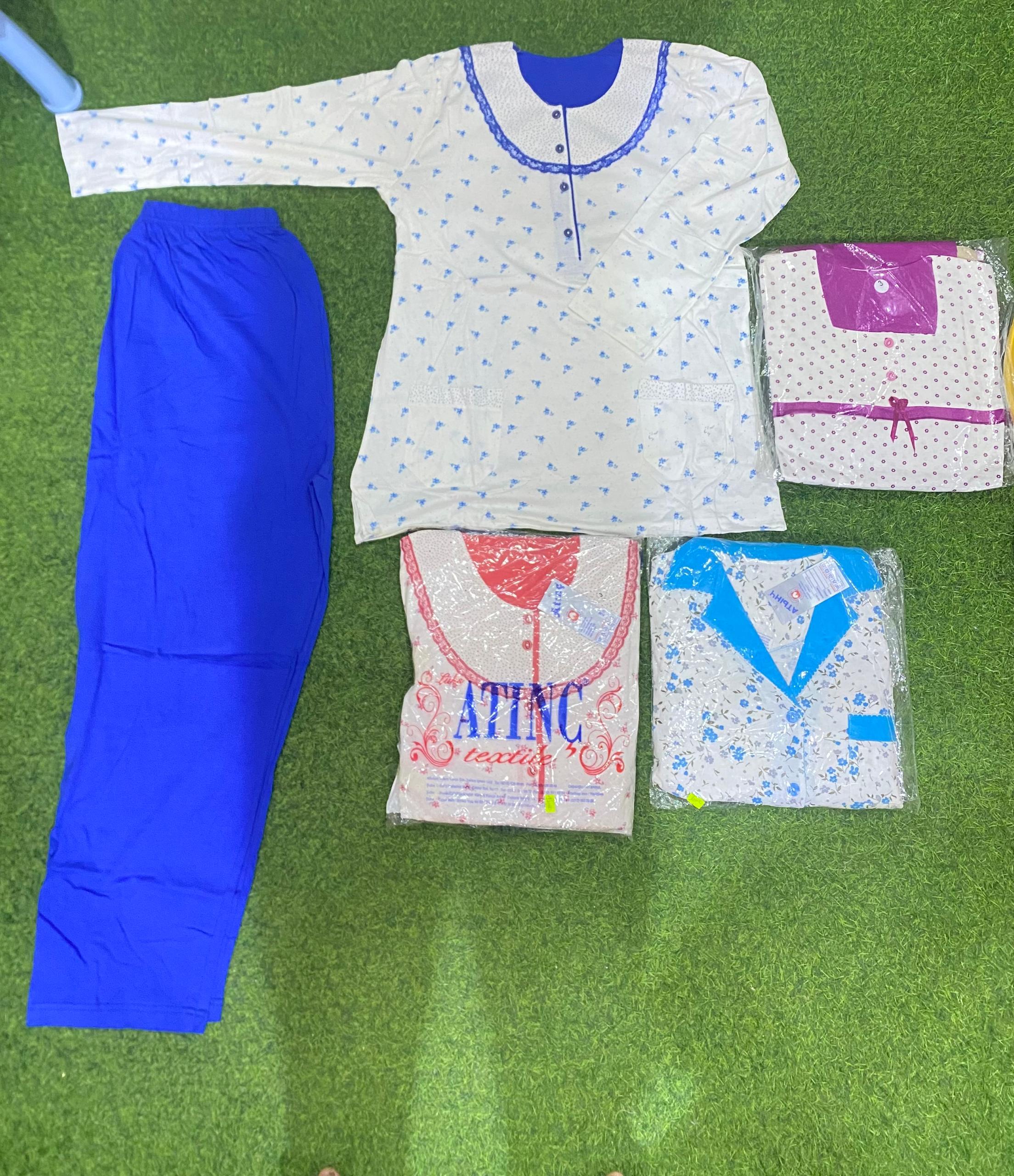 – Ensemble 1 : Haut blanc avec motifs floraux bleus, col arrondi avec boutons et bas bleu assorti.
